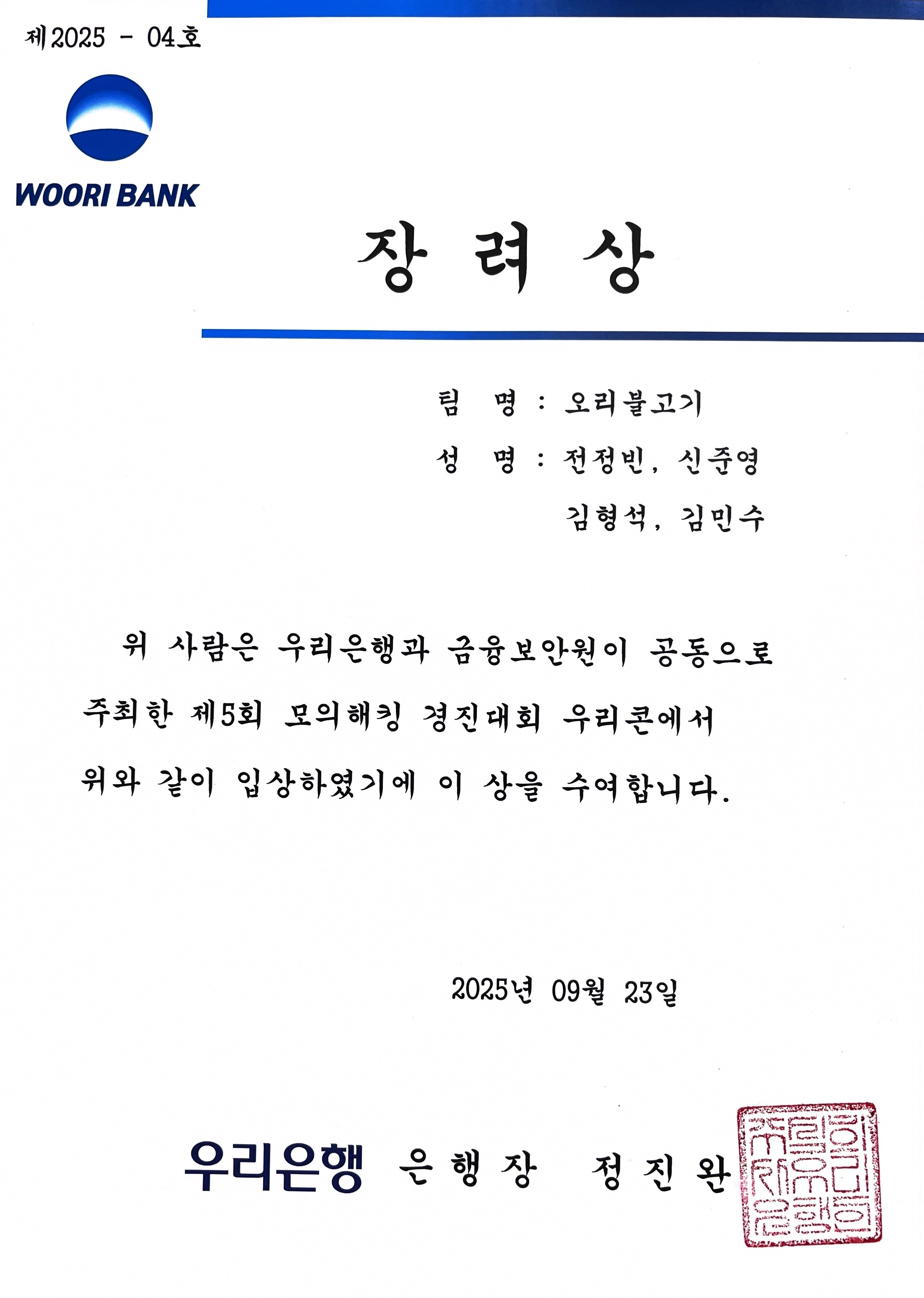제5회 모의 해킹 경진대회 우리콘 장려상 수상