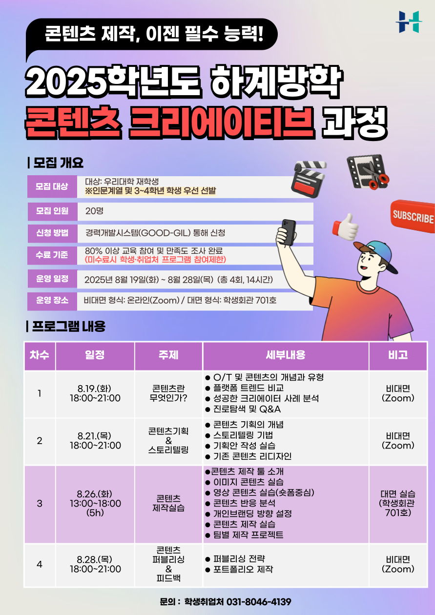 학생취업처 취업지원센터에서 2025 하계방학 [콘텐츠 크리에이티브 과정]을 개설하오니, 많은 참여 부탁드립니다.