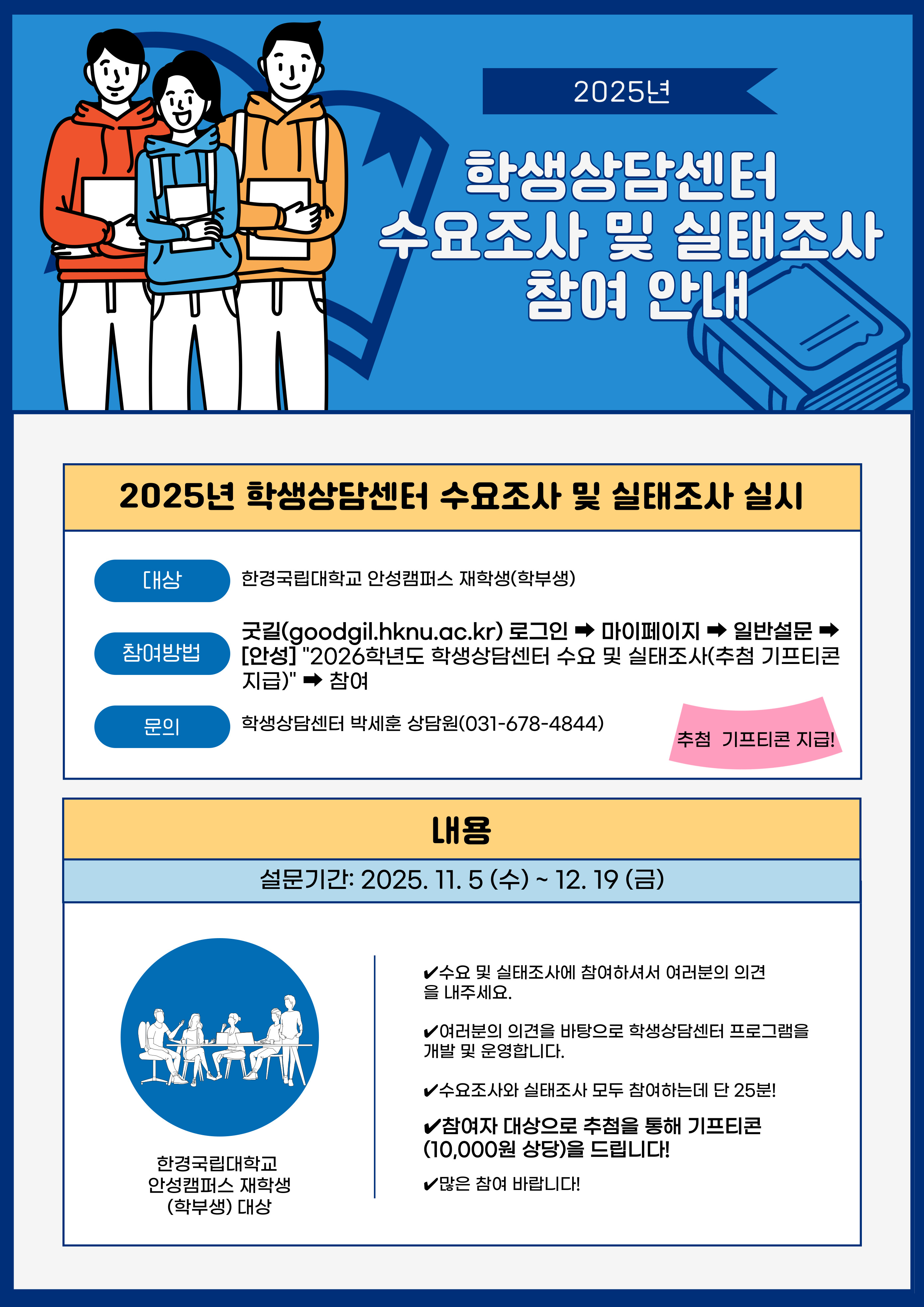 ◦ 경로: 굿길(goodgil.hknu.ac.kr) 로그인 → 마이페이지 → 일반설문 → [안성] 2026학년도 학생상담센터 수요 및 실태조사(추첨 기프티콘 지급) → 참여