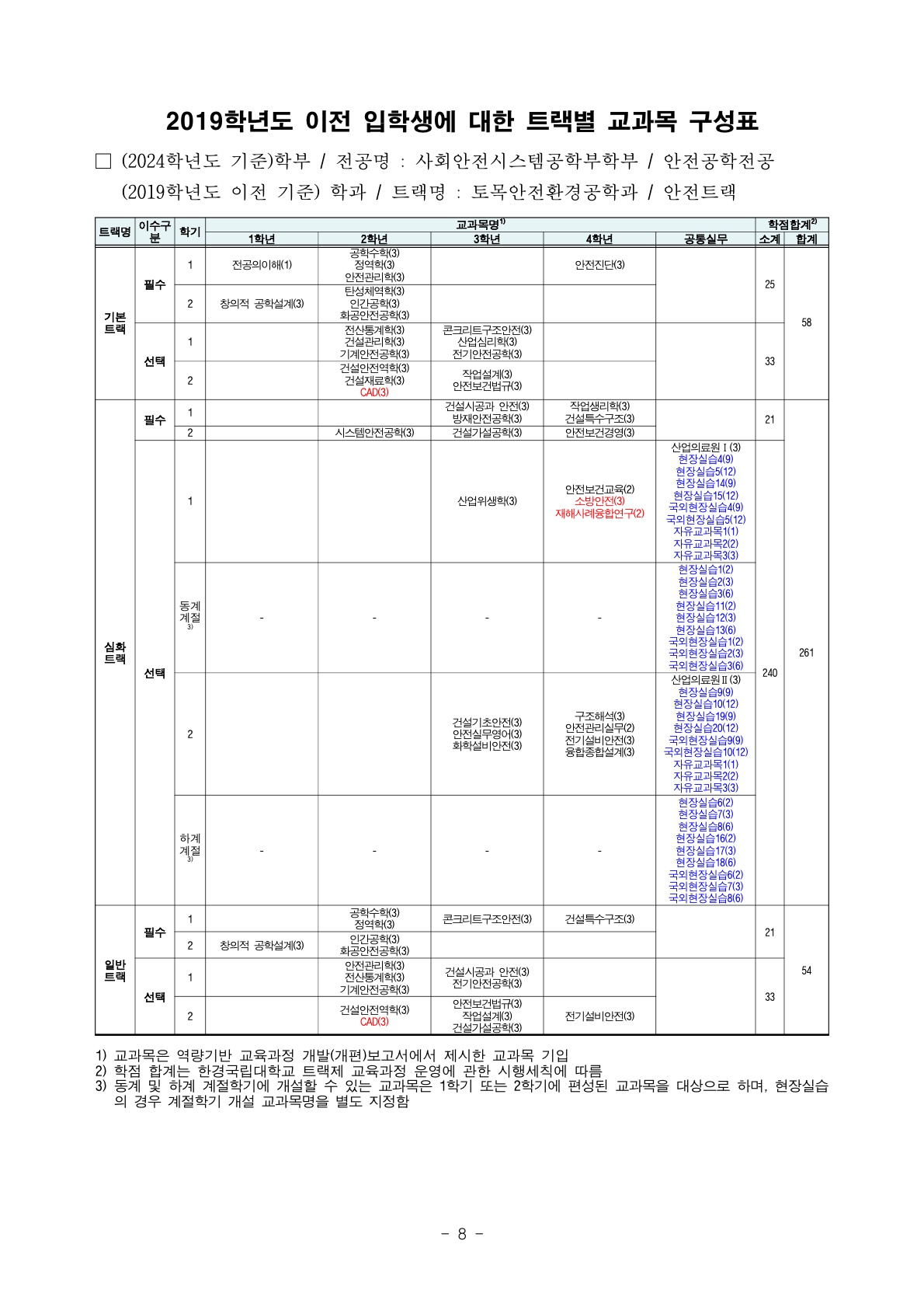 2019학년도 이전 입학생에 대한 트랙별 교과목 구성표