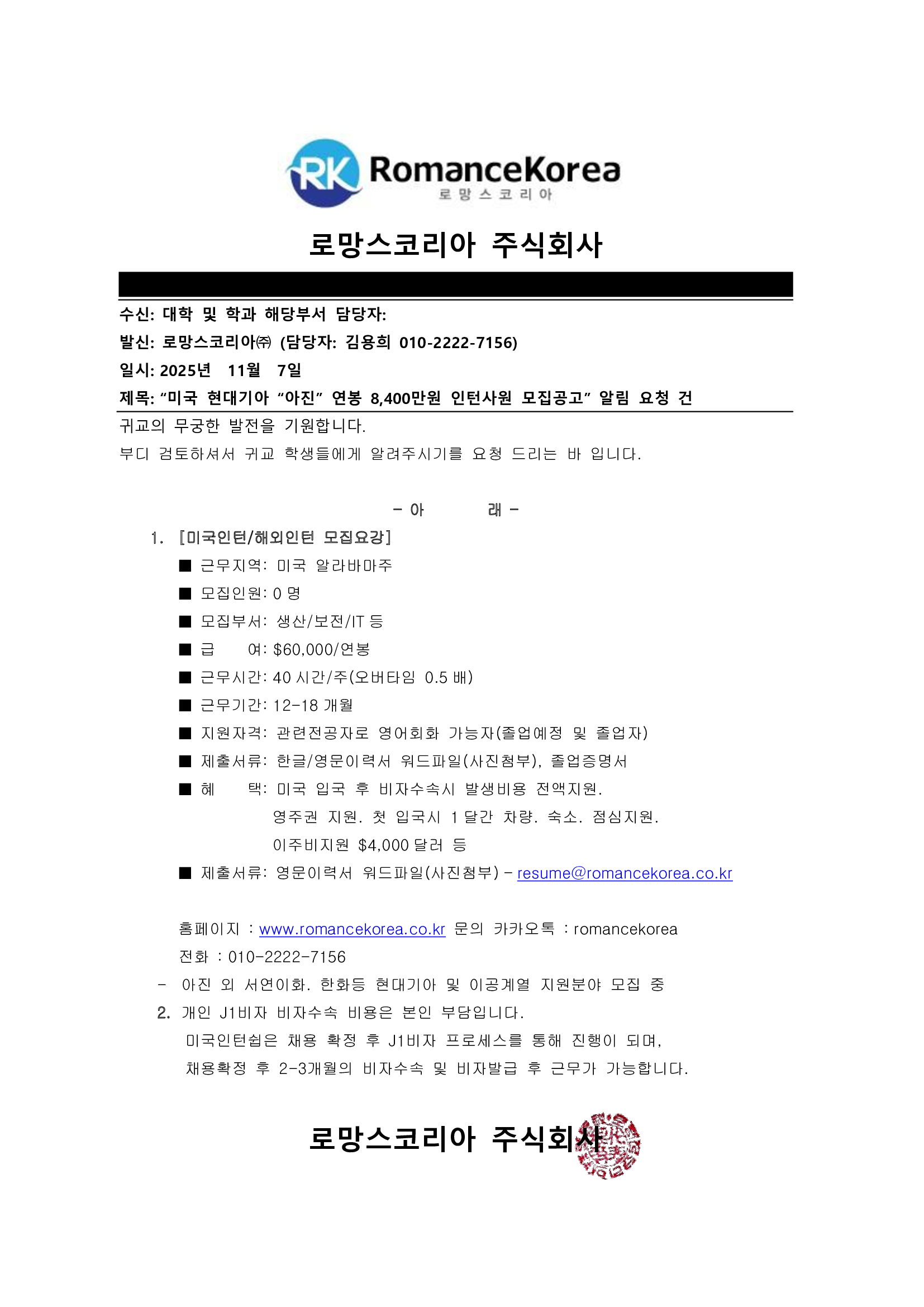 [취업] [로망스코리아] 미국 아진산업 모집공고