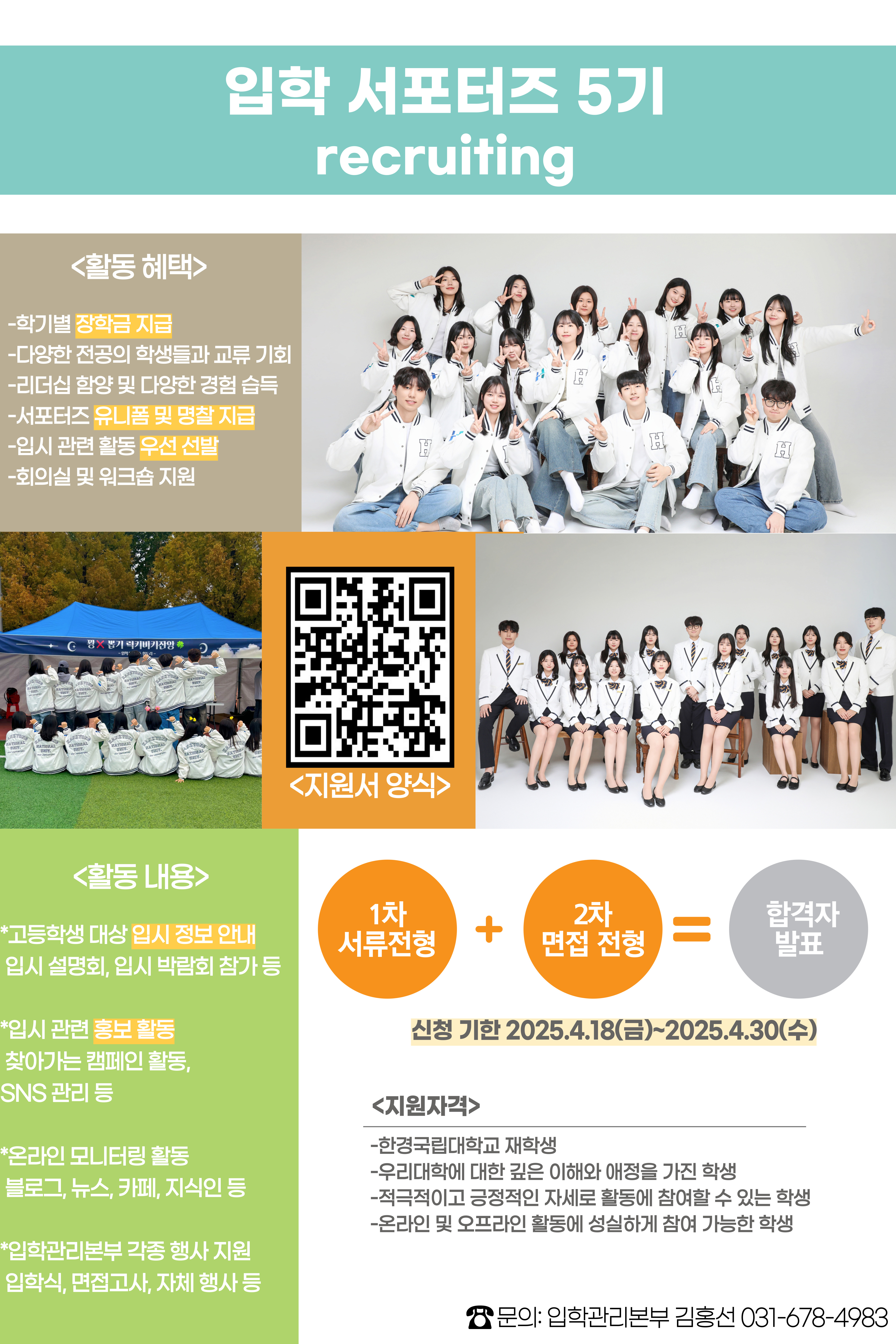 입학관리본부에서 '입학 서포터즈 5기'를 모집하고 있습니다. 열정과 책임감으로 함께할 재학생 여러분의 많은 지원 바랍니다.