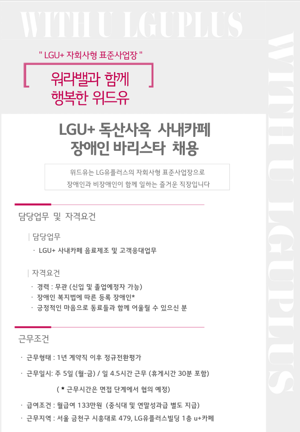 [취창업] (주)위드유_독산사옥 사내카페 바리스타(4H) 채용 공고(발달장애학생)