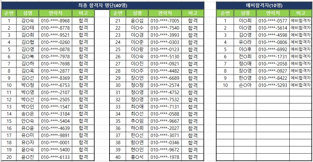 (합격자 성명 가나다 순으로 배열/예비 합격자는 순위별 배열)