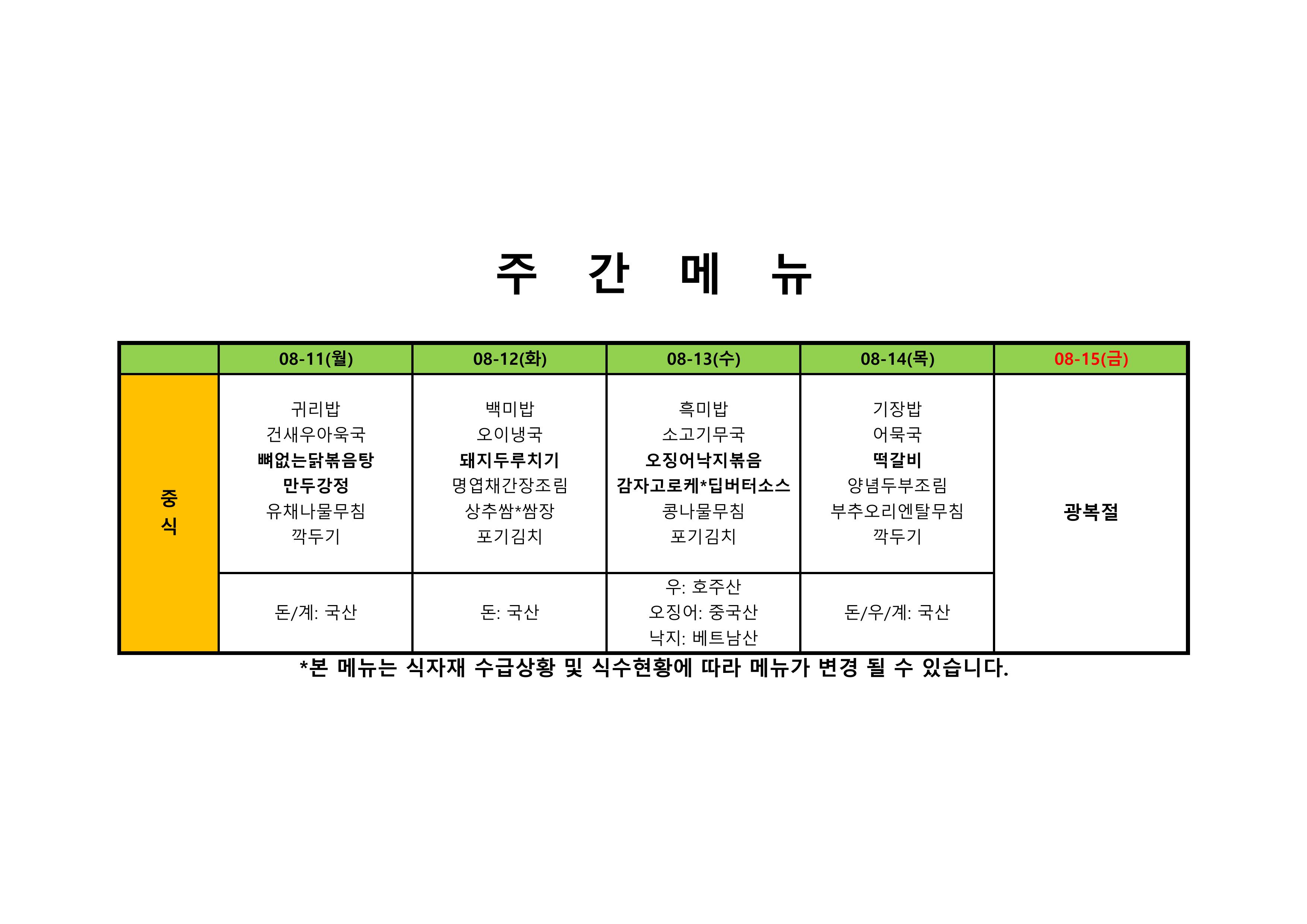 2025. 8. 11. ~ 2025. 8. 14. 주간식단표