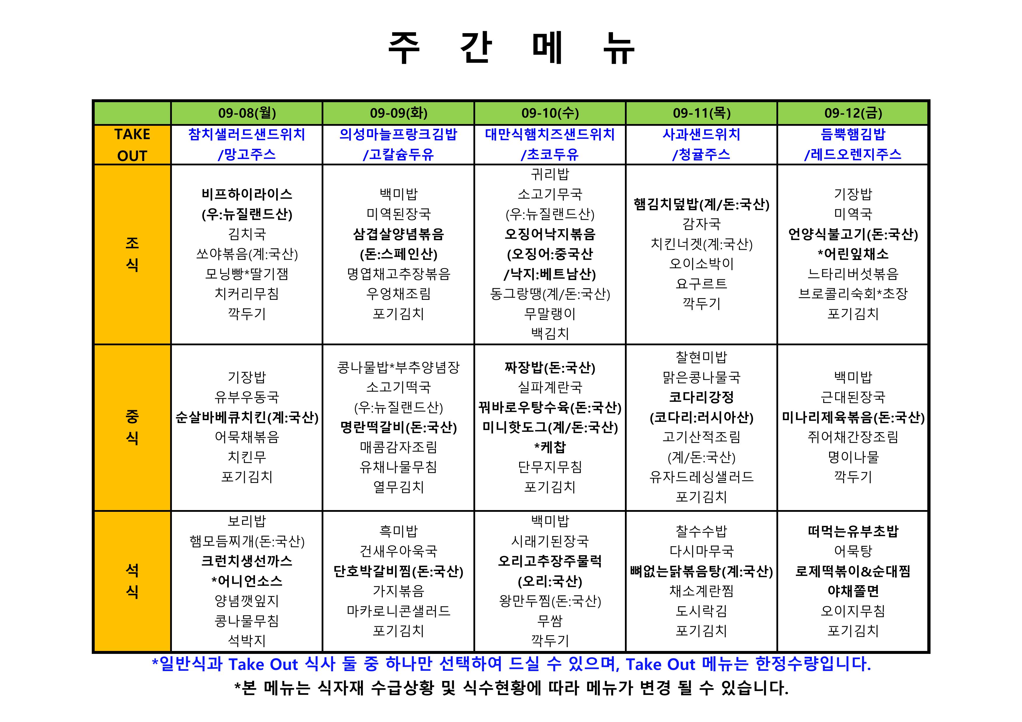 2025. 9. 15. ~ 2025. 9. 19. 주간식단표