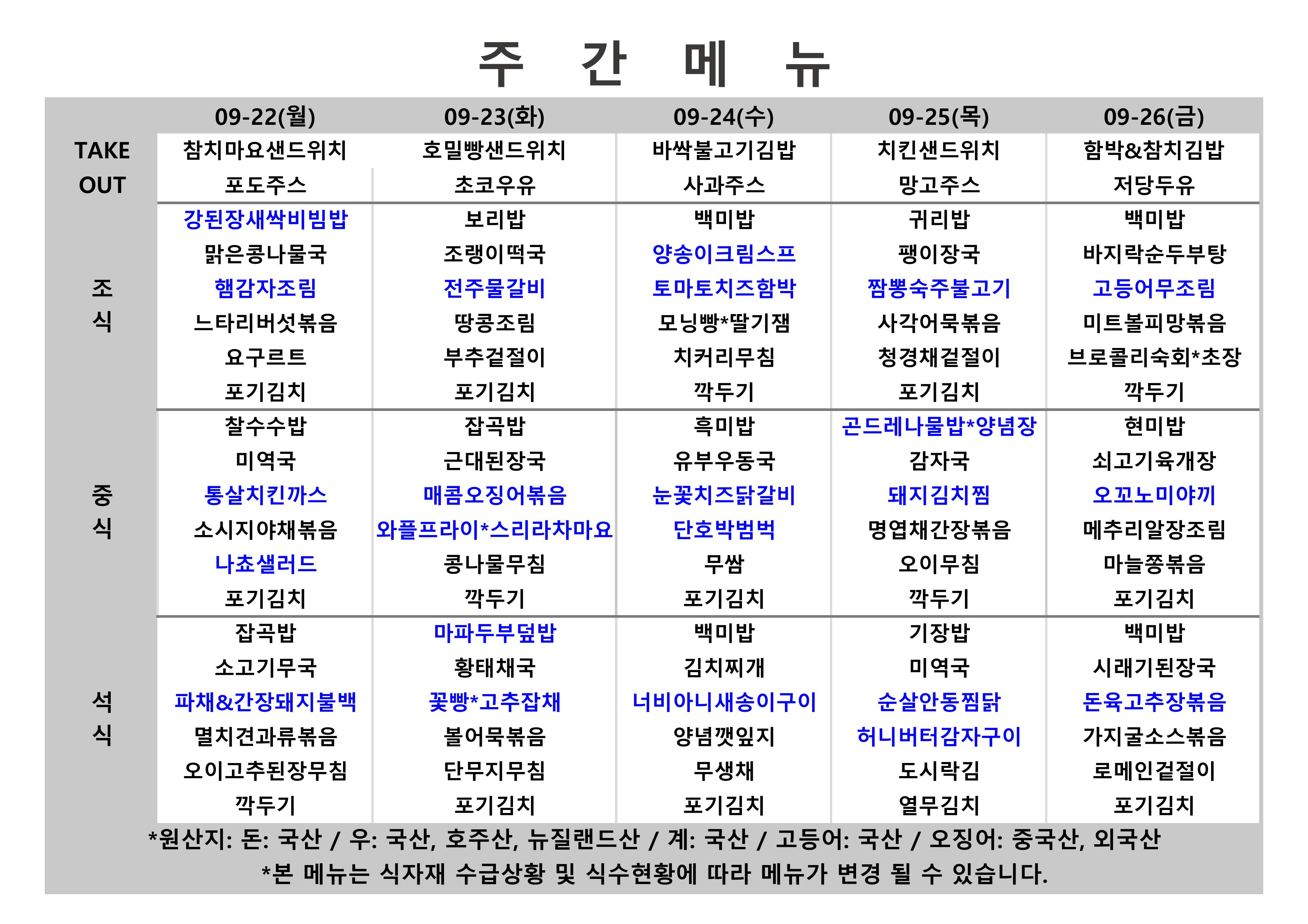 2025. 9. 22. ~ 2025. 9. 26. 주간식단표
