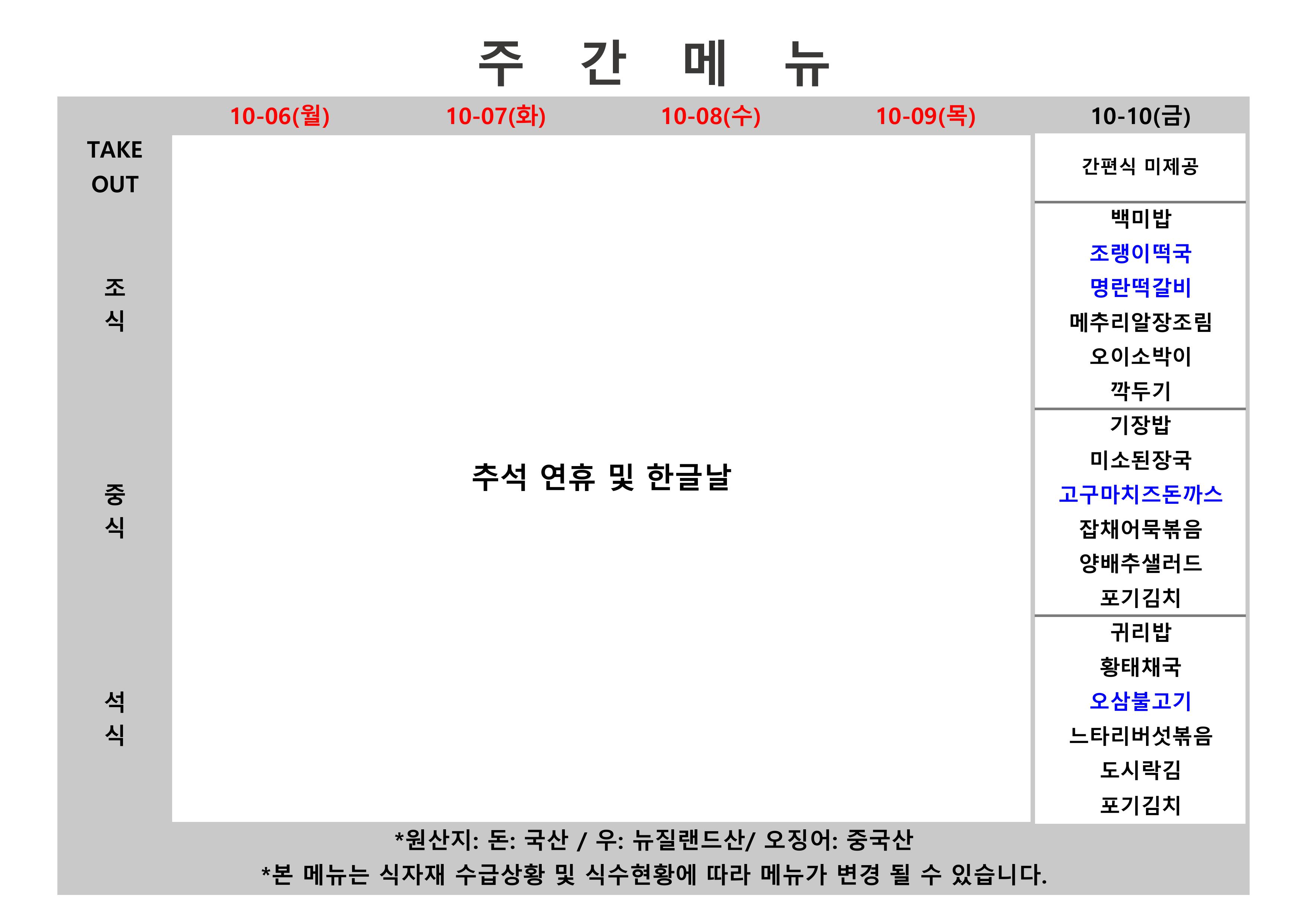 2025. 10. 06. ~ 2025. 10. 10. 주간식단표