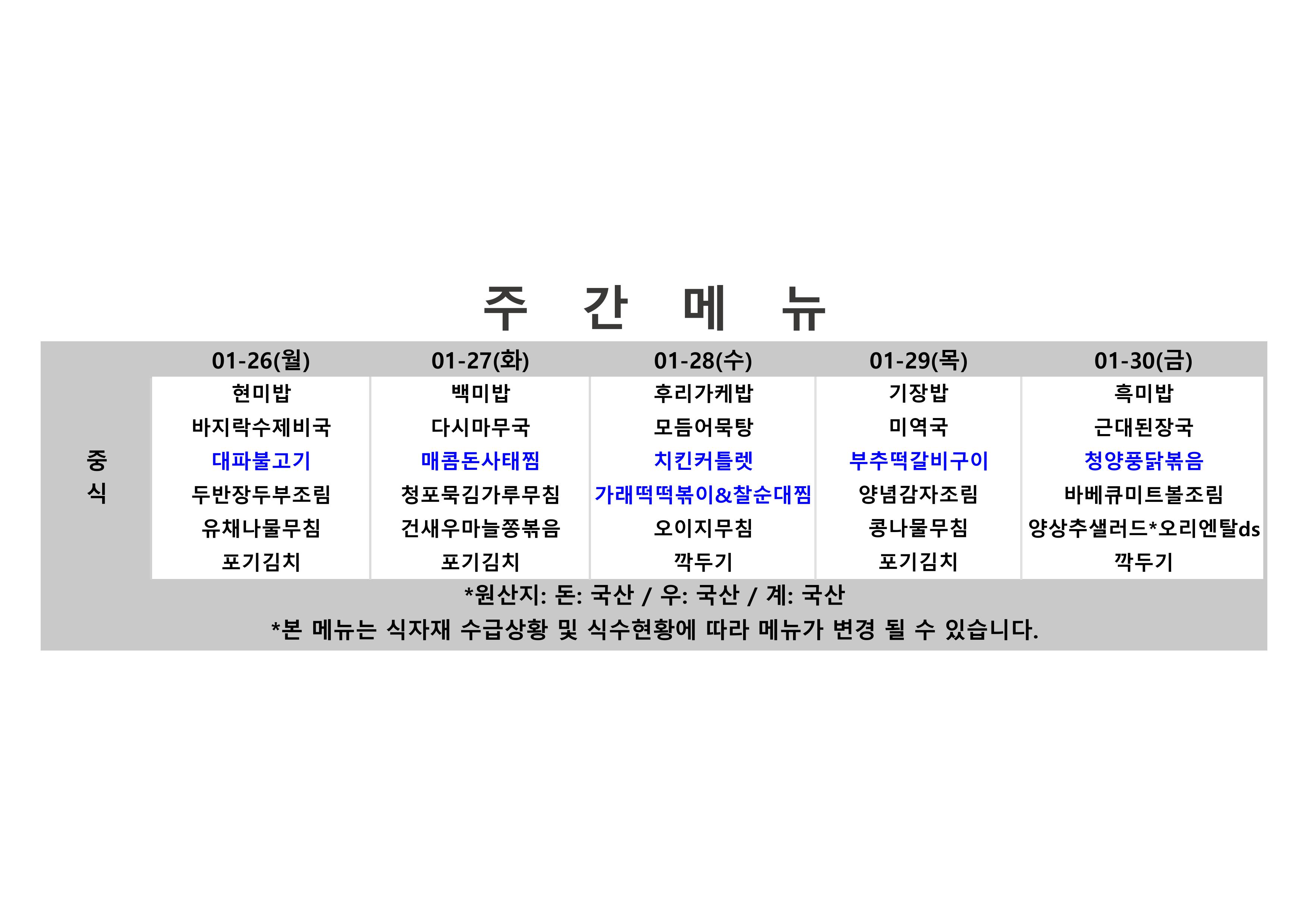 2026. 1. 26. ~ 2026. 1. 30. 주간식단표