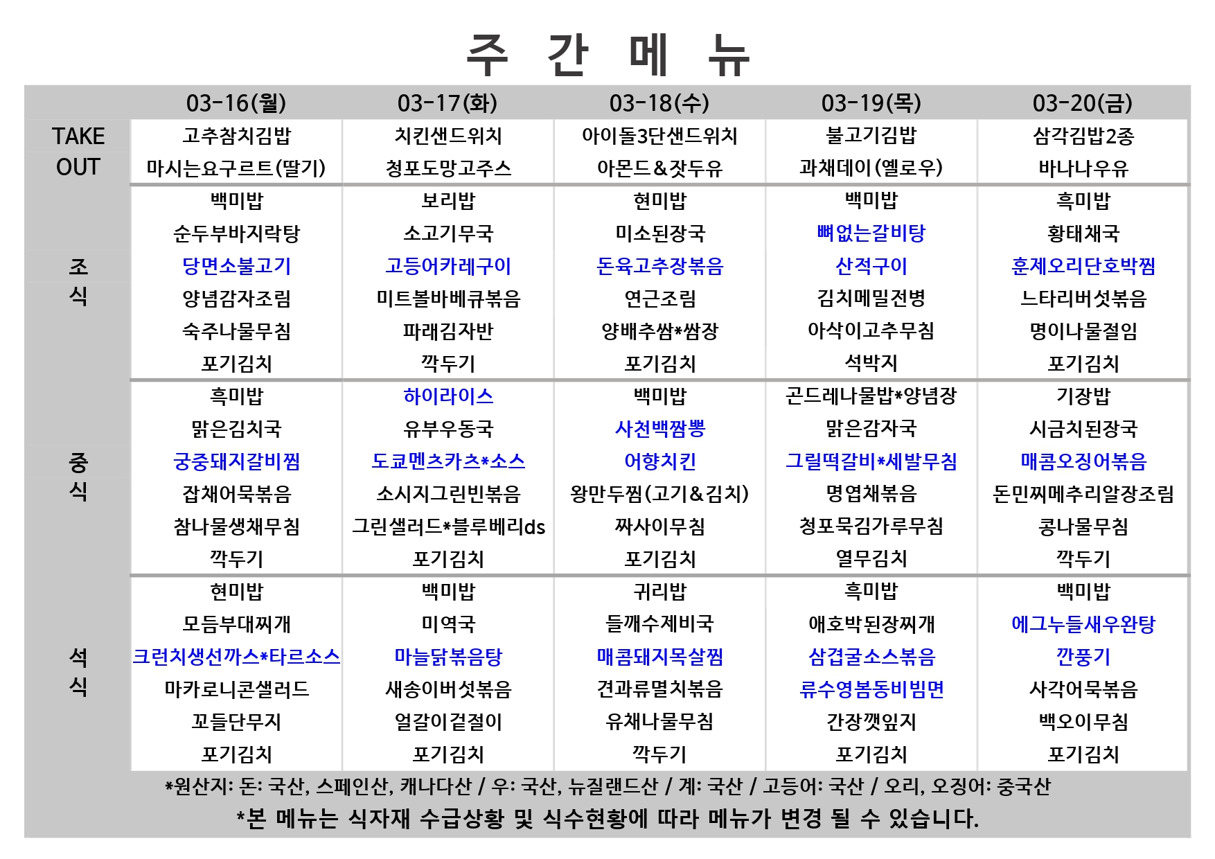 2026. 3. 16. ~ 2026. 3. 20. 주간식단표