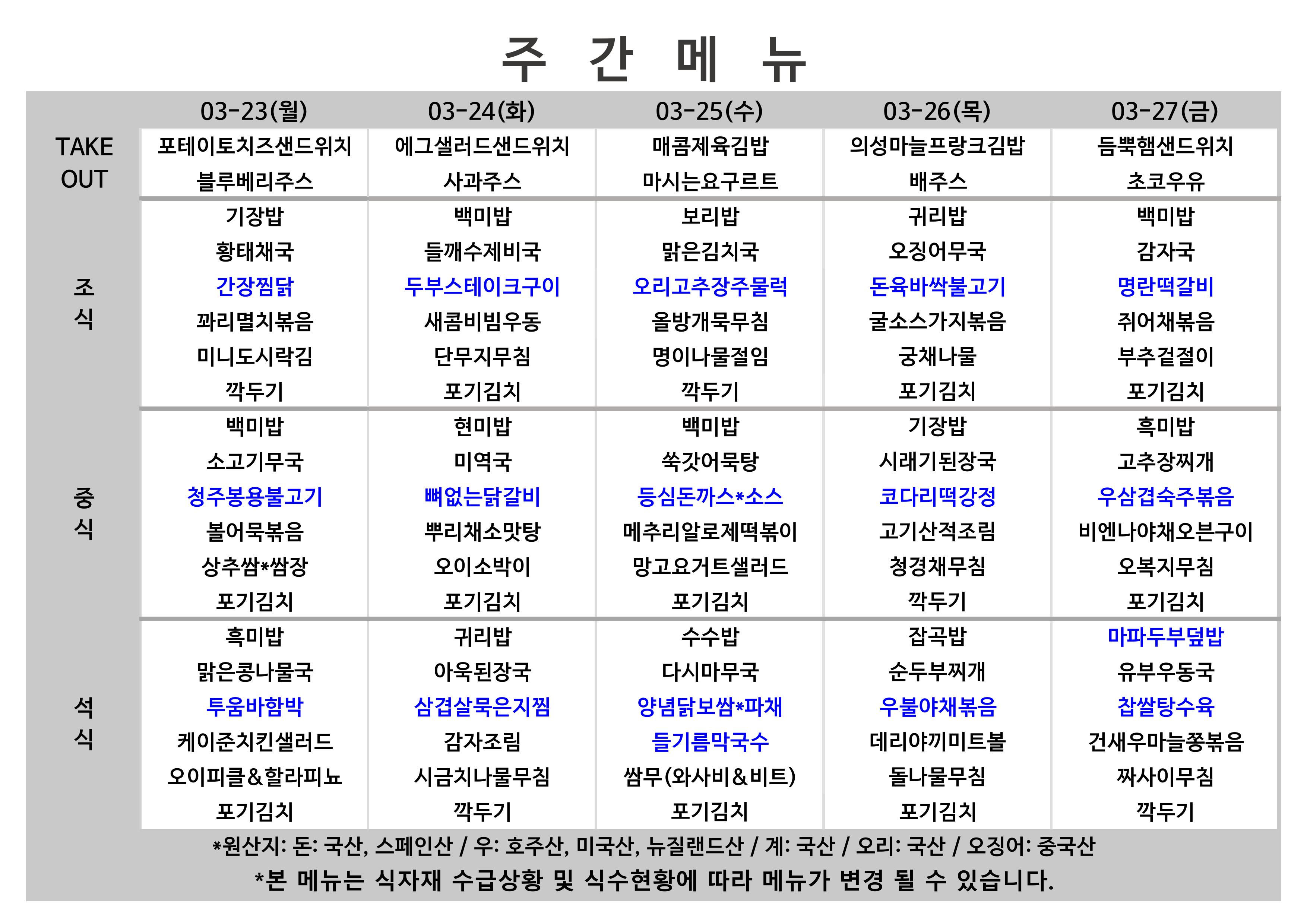 2026. 3. 23. ~ 2026. 3. 27. 주간식단표