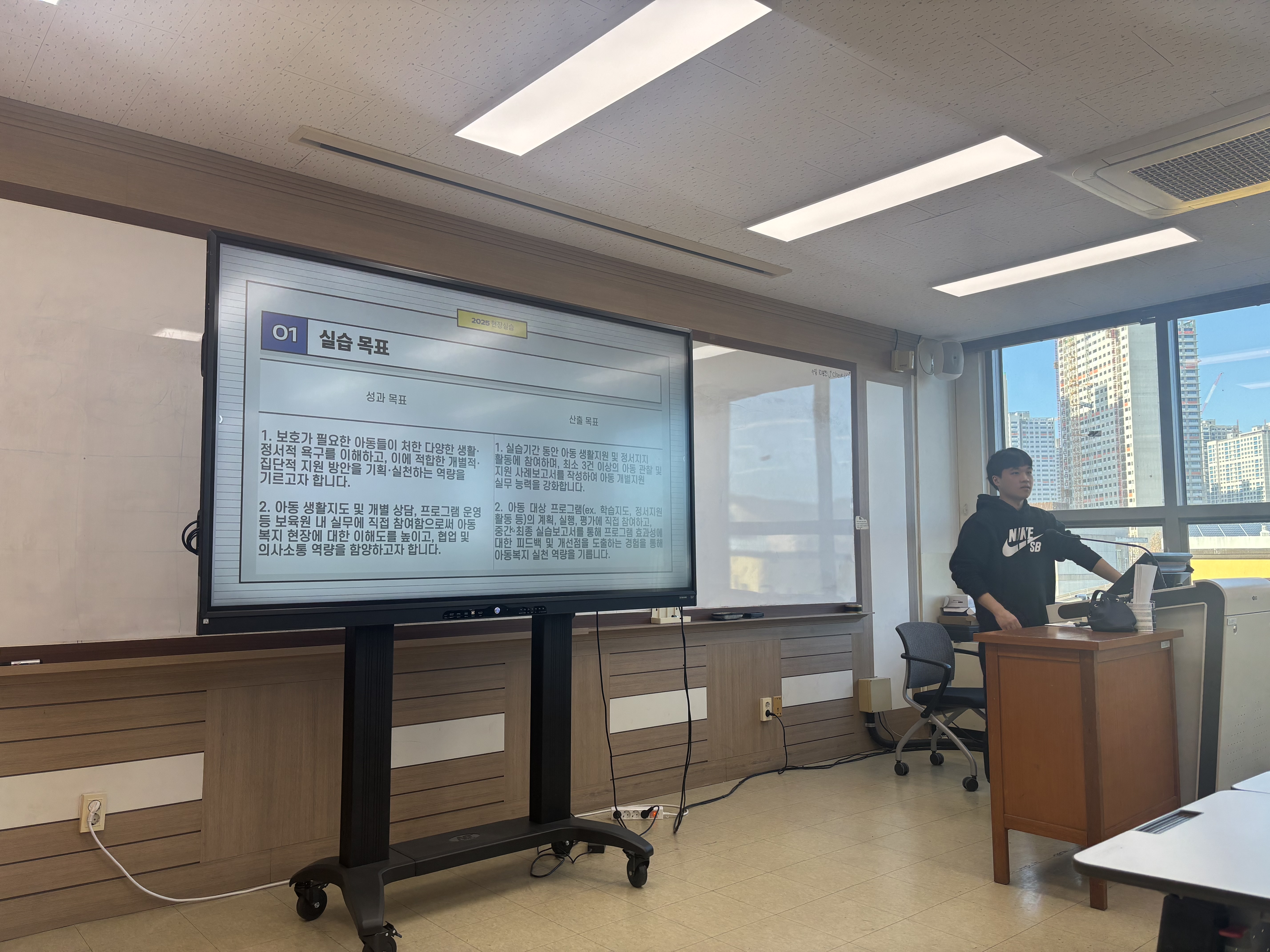 그리고 실습 과정에서의 성찰을 중심으로 발표가 이루어졌습니다. 학생들은 종합사회복지관, 노인복지관, 장애인복지시설, 지역아동센터, 청소년수련관 등 다양한 기관에서의 경험을 구체적으로 소개하였습니다.