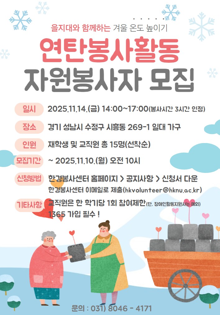fnctId=bbs,fnctNo=374 단축 url 글번호 89794 2025년 을지대와 함께하는 연탄 나누기 봉사활동 참여 안내 작성일 2025.10.30 수정일 2025.10.30 작성자 최다솔 조회수 350 첨부파일 (붙임1) 자원봉사활동 참가신청서_교직원(서식).hwp (붙임2) 자원봉사활동 참가신청서_학생용(서식).hwp