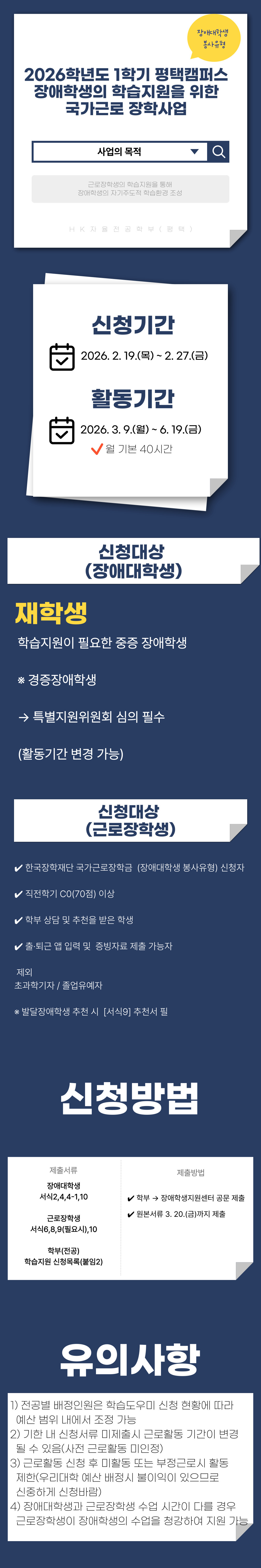 fnctId=bbs,fnctNo=838 단축 url 글번호 92913 2026학년도 1학기 평택캠퍼스 장애학생의 학습지원을 위한 국가근로 장학사업(장애대학생 봉사유형) 안내 작성일 2026.02.13 수정일 2026.02.13 작성자 HK자율전공학부(평택) 조회수 33 첨부파일 근로장학생 서식 6 학습활동 신청서.hwp 근로장학생 서식 8 서약서.hwp 근로장학생 서식 9 (필요시)추천서.hwp 근로장학생 서식 10 민감정보제공동의서.hwp 장애대학생 서식 2 학습지원 신청서.hwp 장애대학생 서식 4 서약서.hwp 장애대학생 서식 4-1 장애인등록증 사본.hwp 장애대학생 서식 10 민감정보제공동의서.hwp