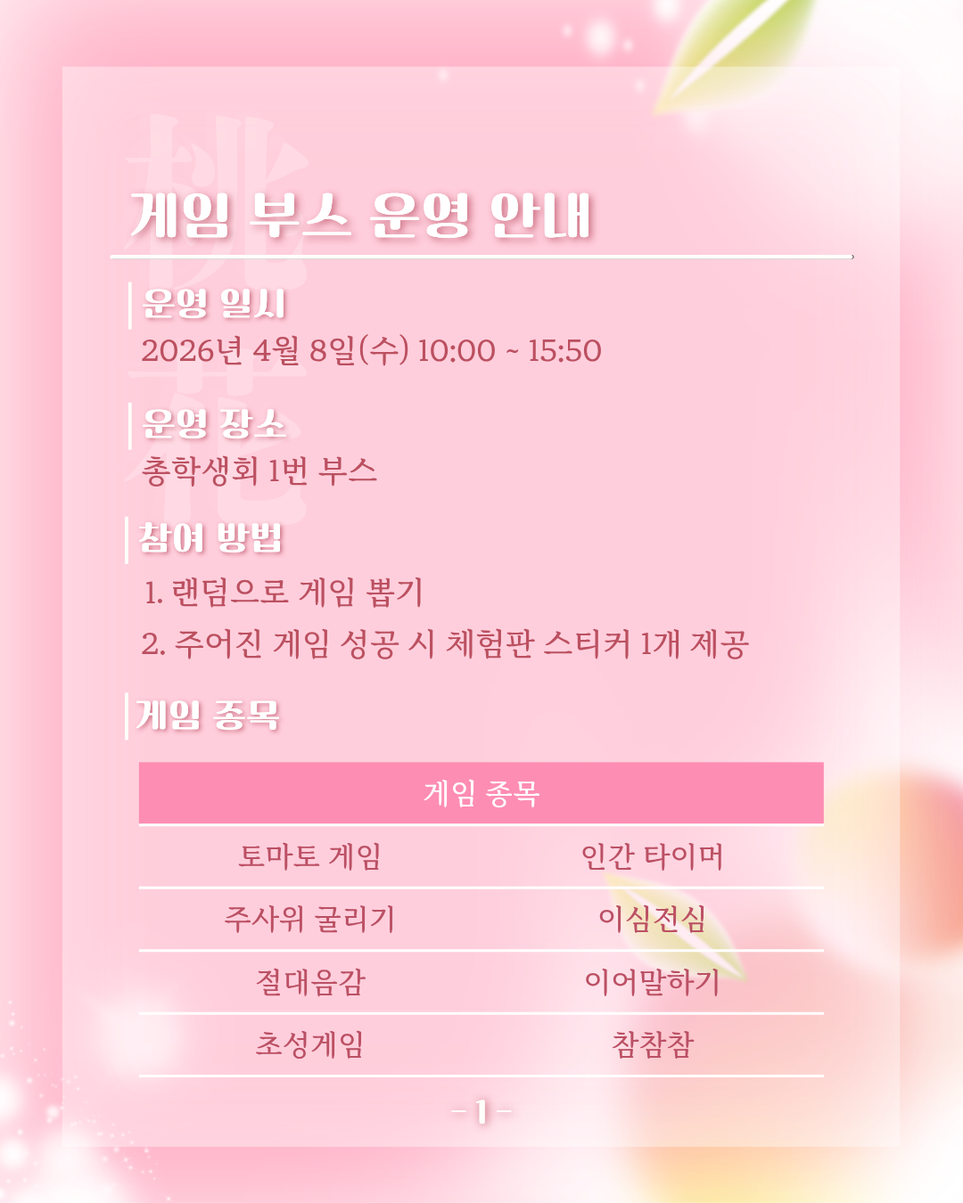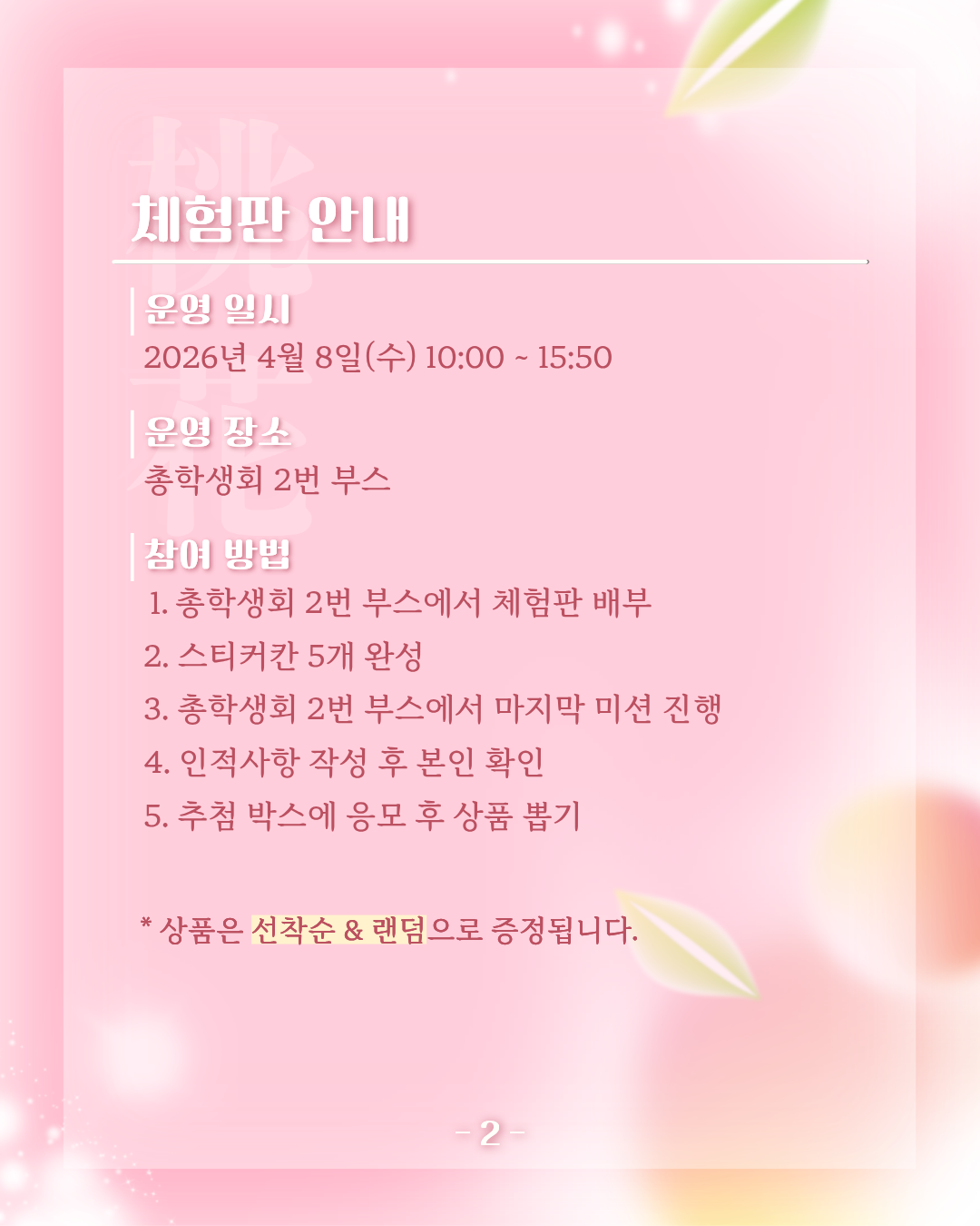 4월 8일 수요일에 진행되는 桃花[도화] 동아리 박람회 총학생회 이벤트 부스 운영 안내드립니다!