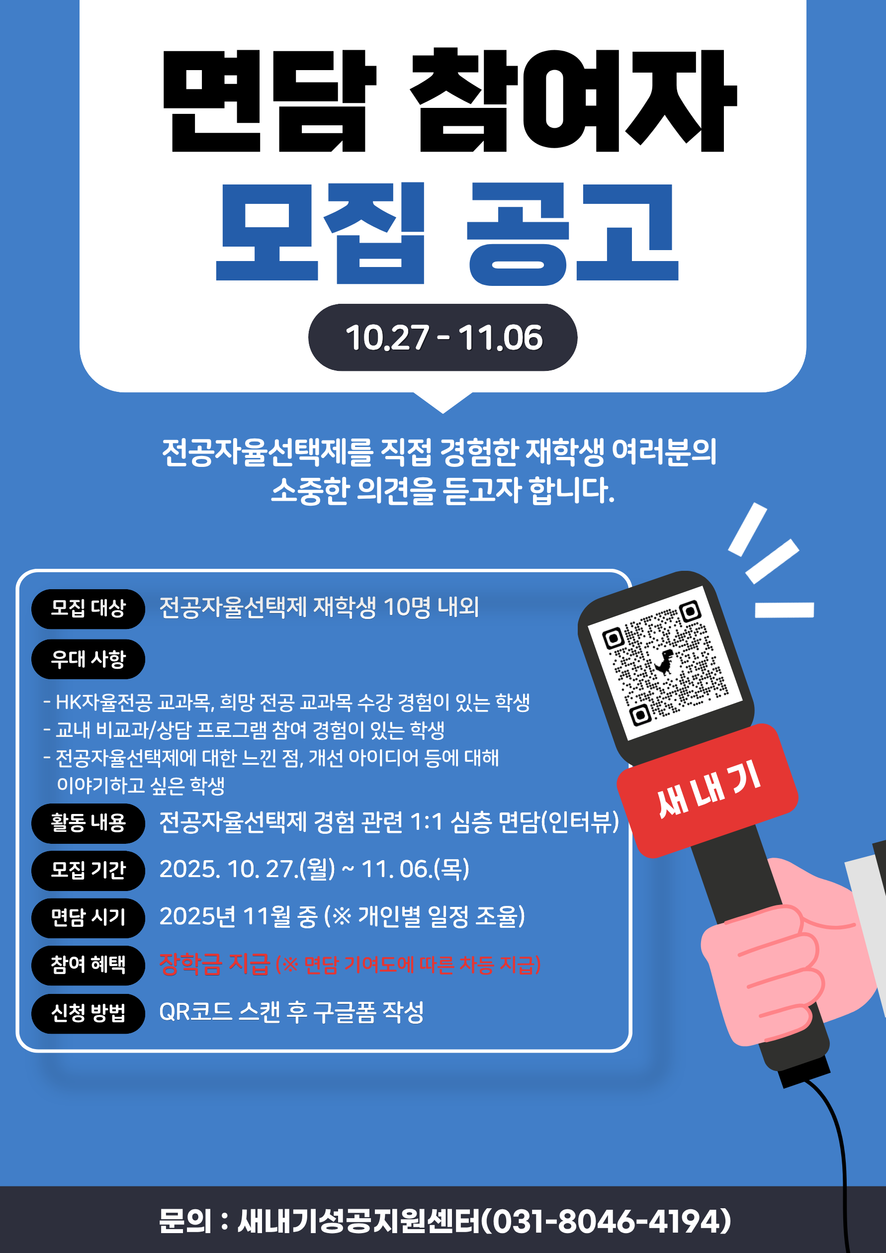 전공자율선택제를 직접 경험한 재학생 여러분의 소중한 의견을 듣고자 심층 면담(인터뷰) 참여자를 모집합니다.