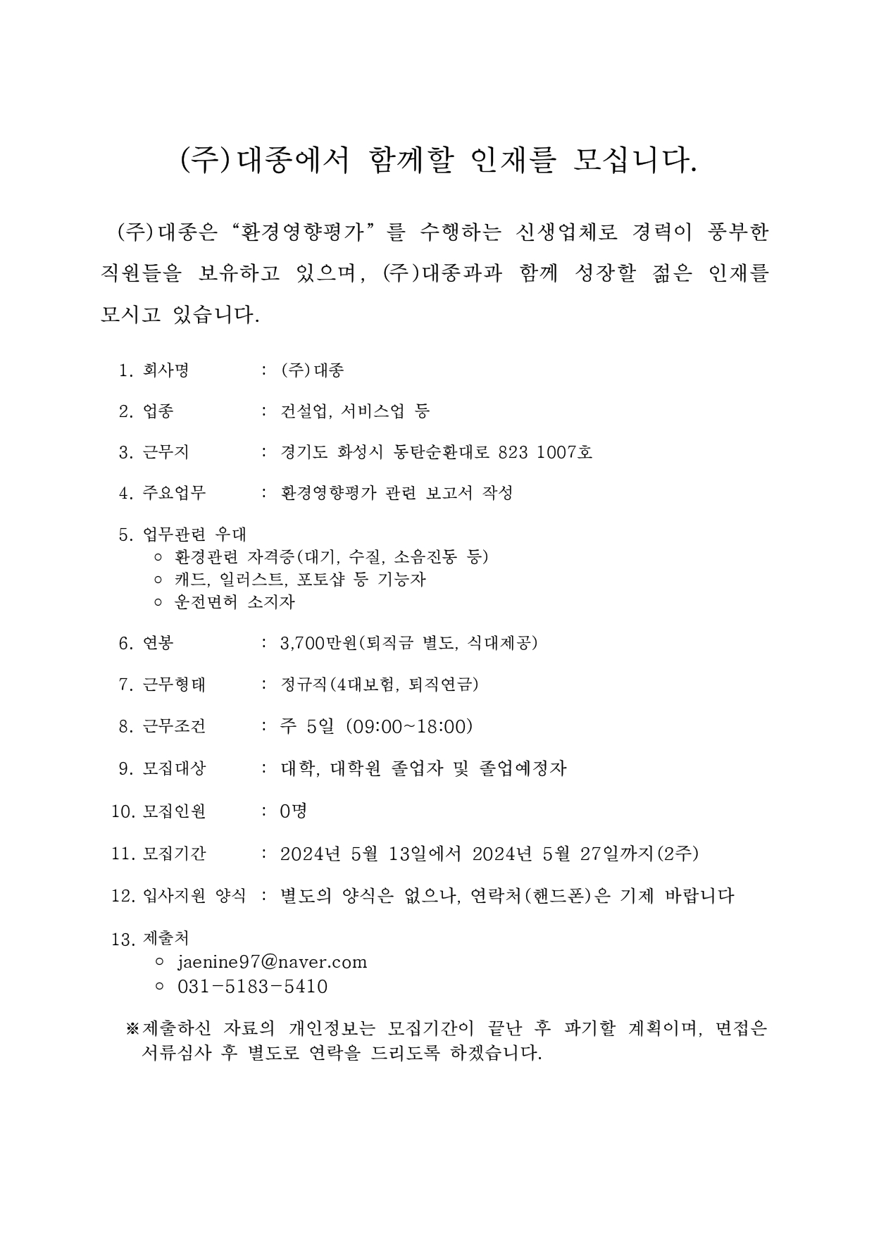 근무형태 : 정규직(4대보험, 퇴직연금)