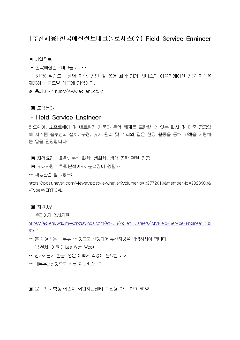 [채용] 한국애질런트테크놀로지스(주) Field Service Engineer
