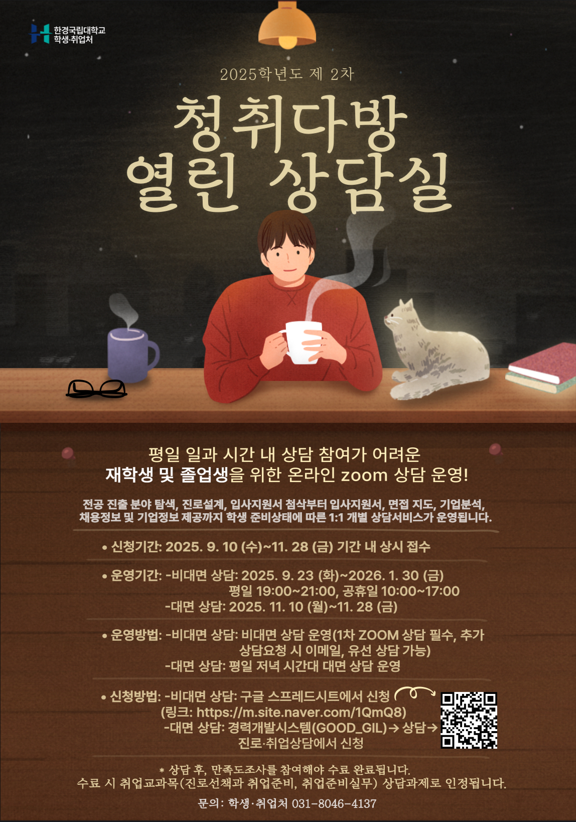 학생 · 취업처 취업지원센터(대학일자리플러스센터)에서는 바쁜 일정으로 평일 낮에 상담 참여가 어려운 학생들을 위해 “청취다방”이라는 대면/비대면 열린 상담실 프로그램을 운영합니다.