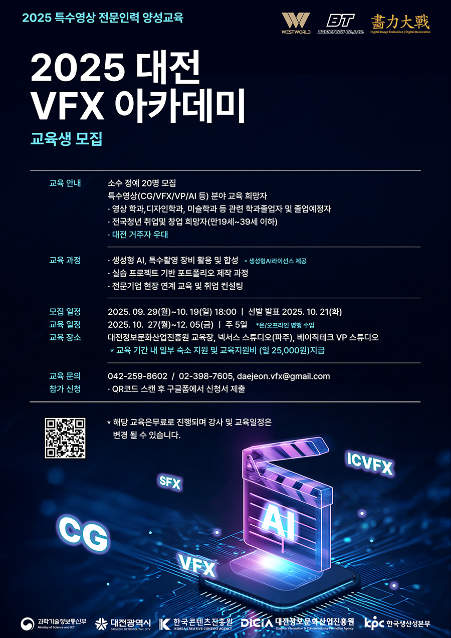 - 교육대상: 특수영상(CG/VFX/VP/AI 등) 분야 교육 희망자(전국 청년 취업 및 창업 희망자)