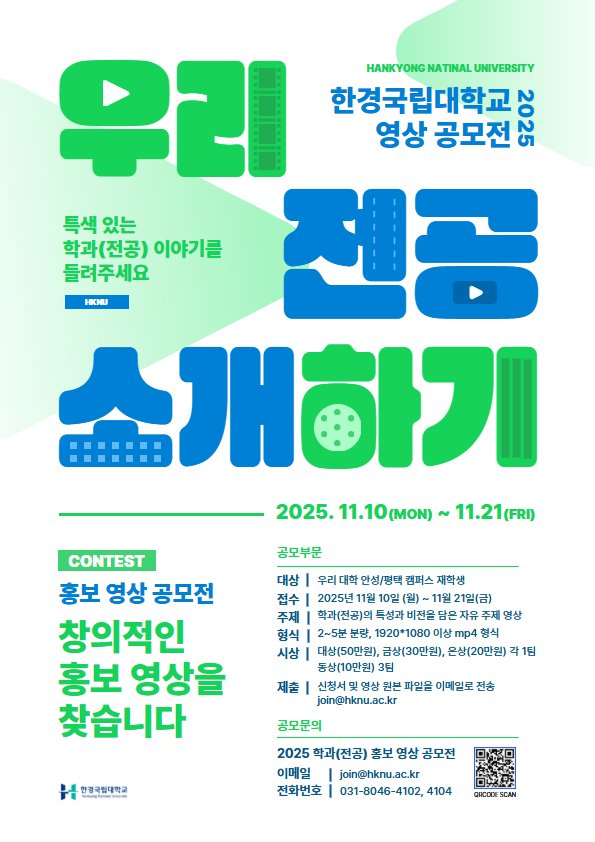 - 제출: 신청서 및 영상 원본, 홍보실 이메일(join@hknu.ac.kr)로 전송