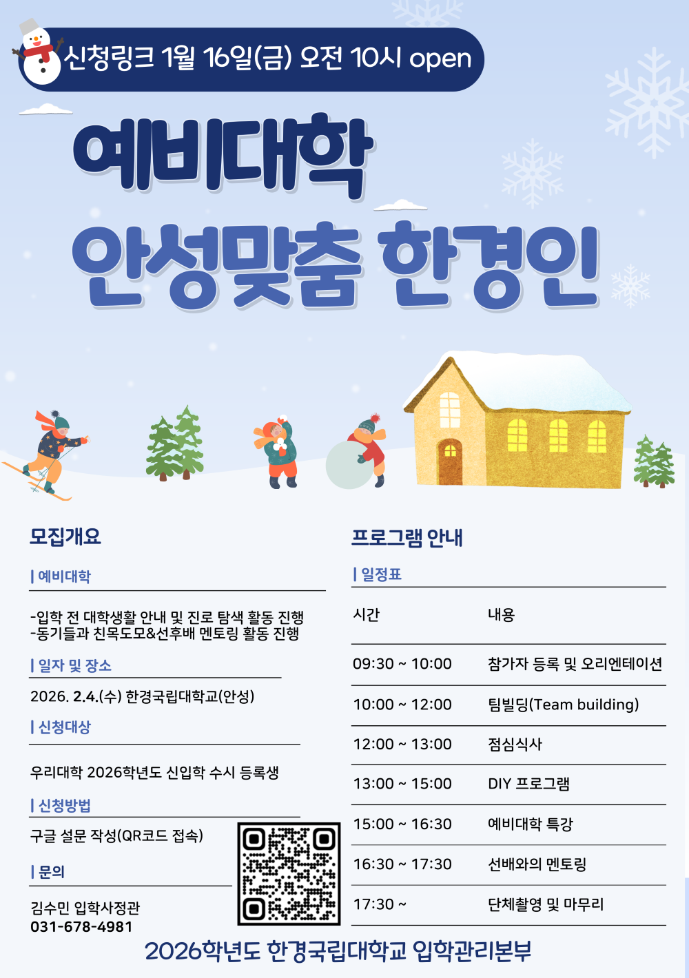 안녕하세요. 입학관리본부입니다. 2026학년도 신입생(수시등록생)을 대상으로 예비대학 '안성맞춤 한경인' 프로그램을 진행하오니