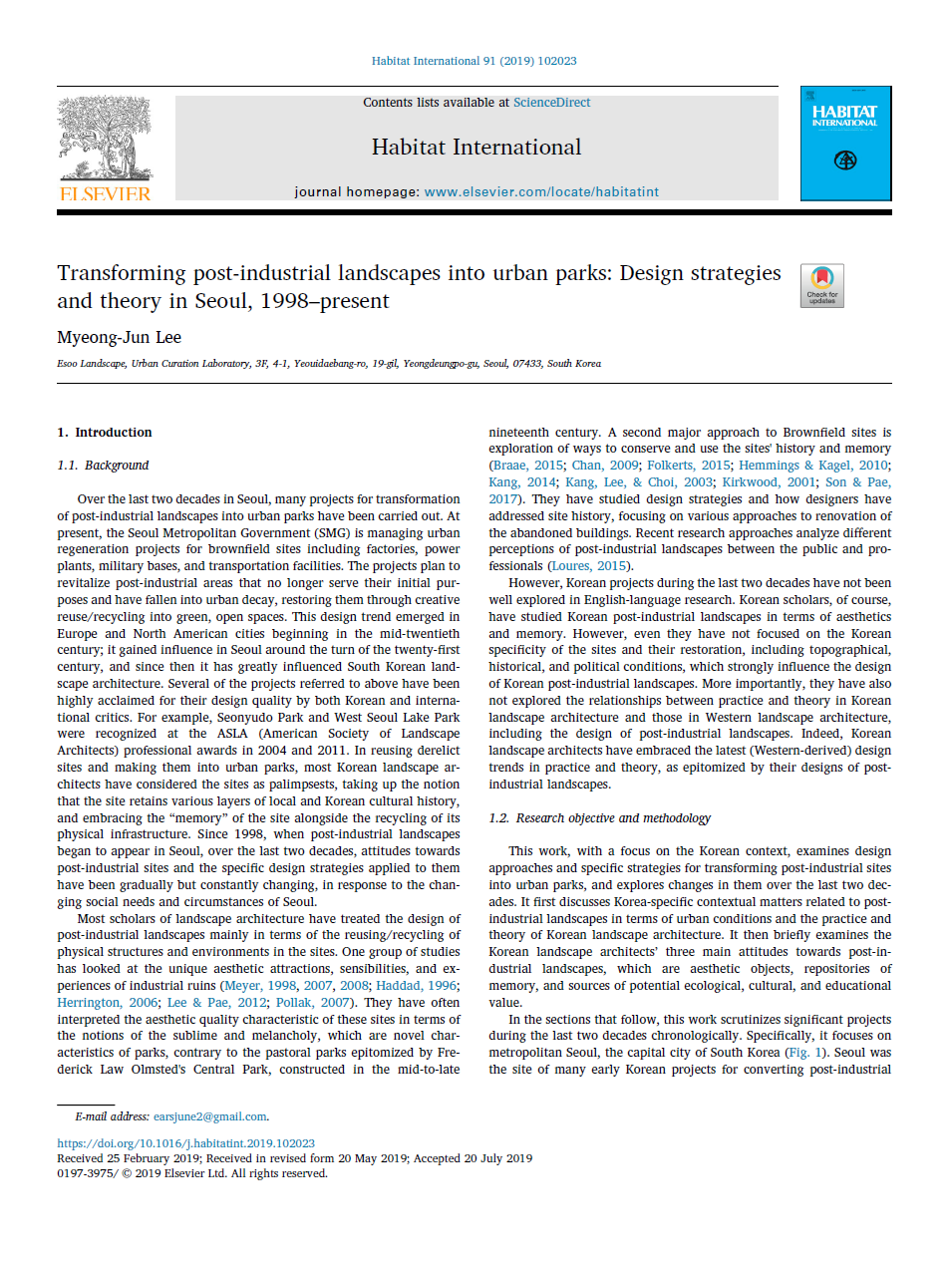 Myeong-Jun Lee(2019) Transforming Post-industrial Landscapes into Urban Parks: Design Strategies and Theory in Seoul, 1998–present. Habitat International 91: 102023.