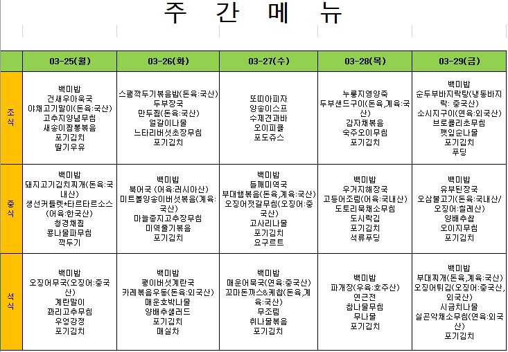 2024. 3. 25. ~ 2024. 3. 29. 주간식단표