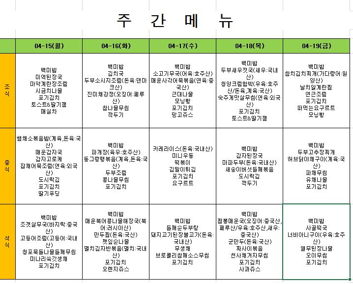 2024. 4. 15. ~ 2024. 4. 19. 주간식단표
