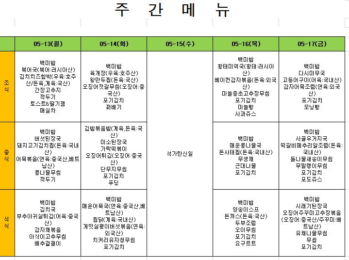 2024. 5. 13. ~ 2024. 5. 17. 주간식단표