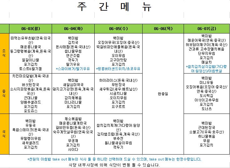 2024. 6. 3. ~ 2024. 6. 7. 주간식단표