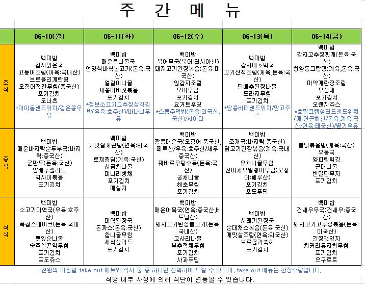 2024. 6. 10. ~ 2024. 6. 14. 주간식단표