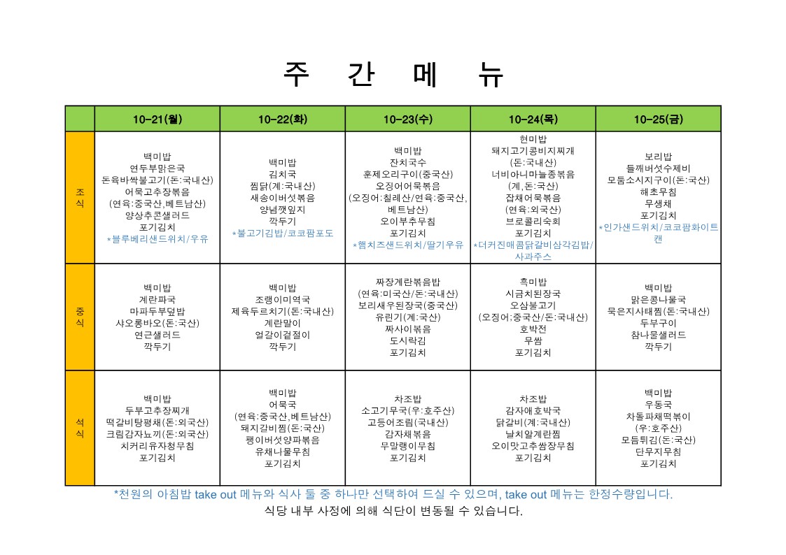 2025. 10. 20. ~ 2025. 10. 24. 주간식단표