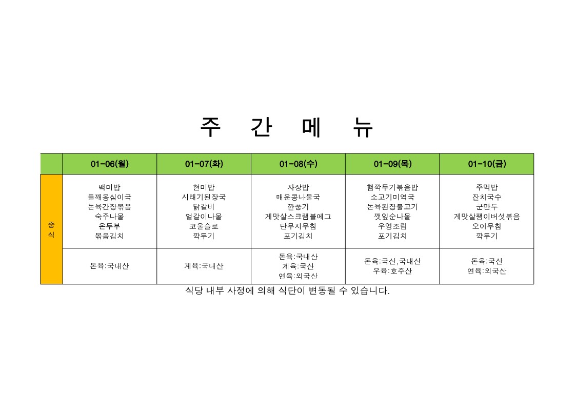 2026. 1. 5. ~ 2026. 1. 9. 주간식단표
