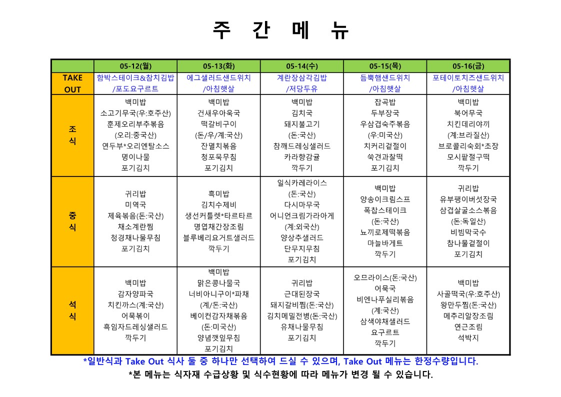 2024. 5. 13. ~ 2024. 5. 17. 주간식단표