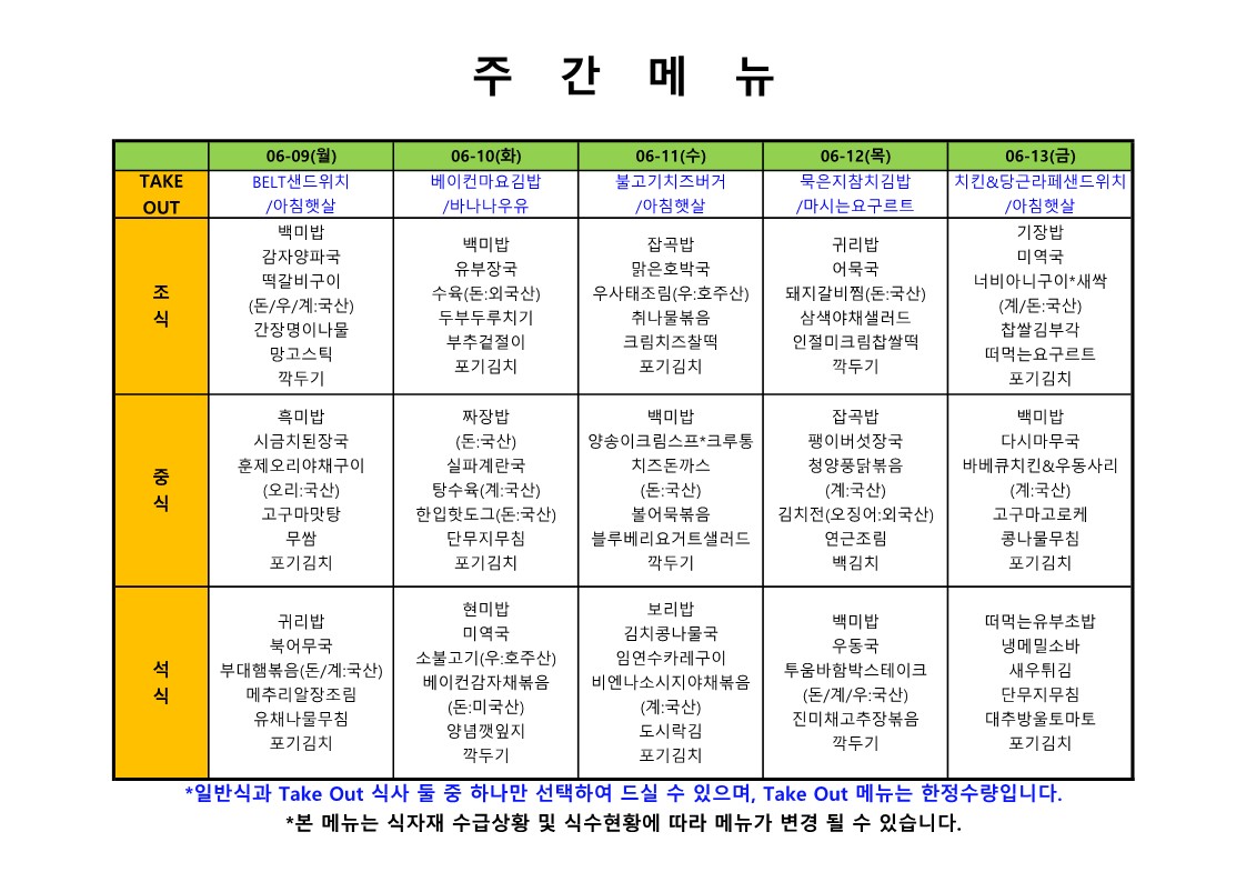 2024. 6. 10. ~ 2024. 6. 14. 주간식단표