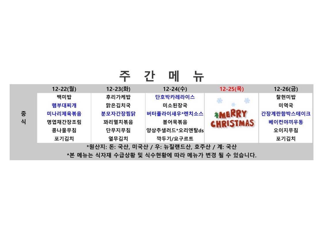 2025. 12. 22. ~ 2025. 12. 26. 주간식단표