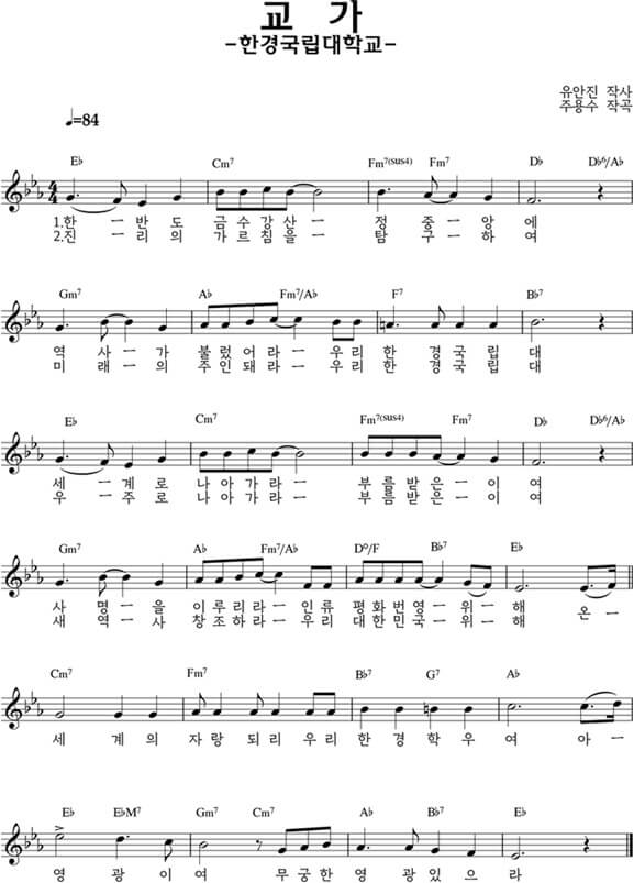 第一节 在韩半岛锦绣江山的中央 历史在呼唤,我们的韩京国立大 呼吁我们走向世界 要完成使命,为了人类的和平繁荣 我们韩京校友将会是世界的骄傲 啊,光荣,愿无穷的荣光下去 第二节 探究真理的教导 成为未来的主人吧,我们韩京国立大 呼吁我们走向宇宙 创造新历史吧,为了我们大韩民国 我们韩京校友将会是世界的骄傲 啊,光荣,愿无穷的荣光下去