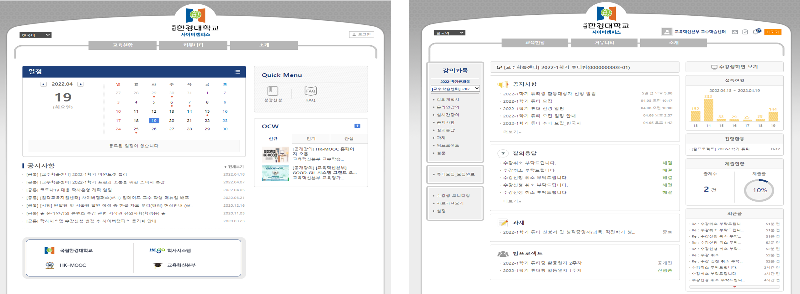 교내 정규교과목에 대한 온라인강의실을 개설하고 공지사항, 강의자료, 출석, 과제, 팀프로젝트 등 다양한 수업활동이 이루어 질 수 있도록 관리/운영하고 있습니다. 비정규과목 중 온라인으로 실시되는 과목을 개설하여 수업활동을 지원하고 있습니다. 사이버캠퍼스(LMS) 바로가기