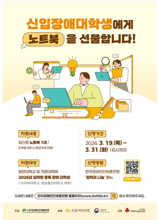 fnctId=bbs,fnctNo=358 단축 url 글번호 94436 2026 KB 신입 장애대학생 노트북 지원사업 안내 작성일 2026.03.31 수정일 2026.03.31 작성자 장애학생지원센터(본원) 조회수 382 첨부파일 (붙임)2026 KB 신입 장애대학생 노트북 지원사업 안내.hwp