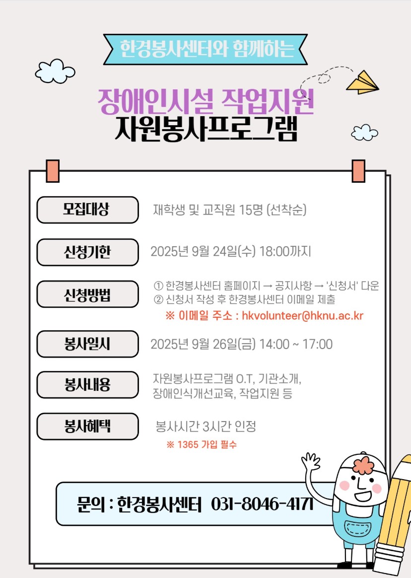 fnctId=bbs,fnctNo=374 단축 url 글번호 88796 2025학년도 평안밀알복지재단 봉사활동 참여자 모집 작성일 2025.09.18 수정일 2025.09.18 작성자 최다솔 조회수 618 첨부파일 참여 홍보 포스터.jpg (붙임1) 자원봉사활동 참가신청서_교직원(서식).hwp (붙임2) 자원봉사활동 참가신청서_학생용(서식).hwp