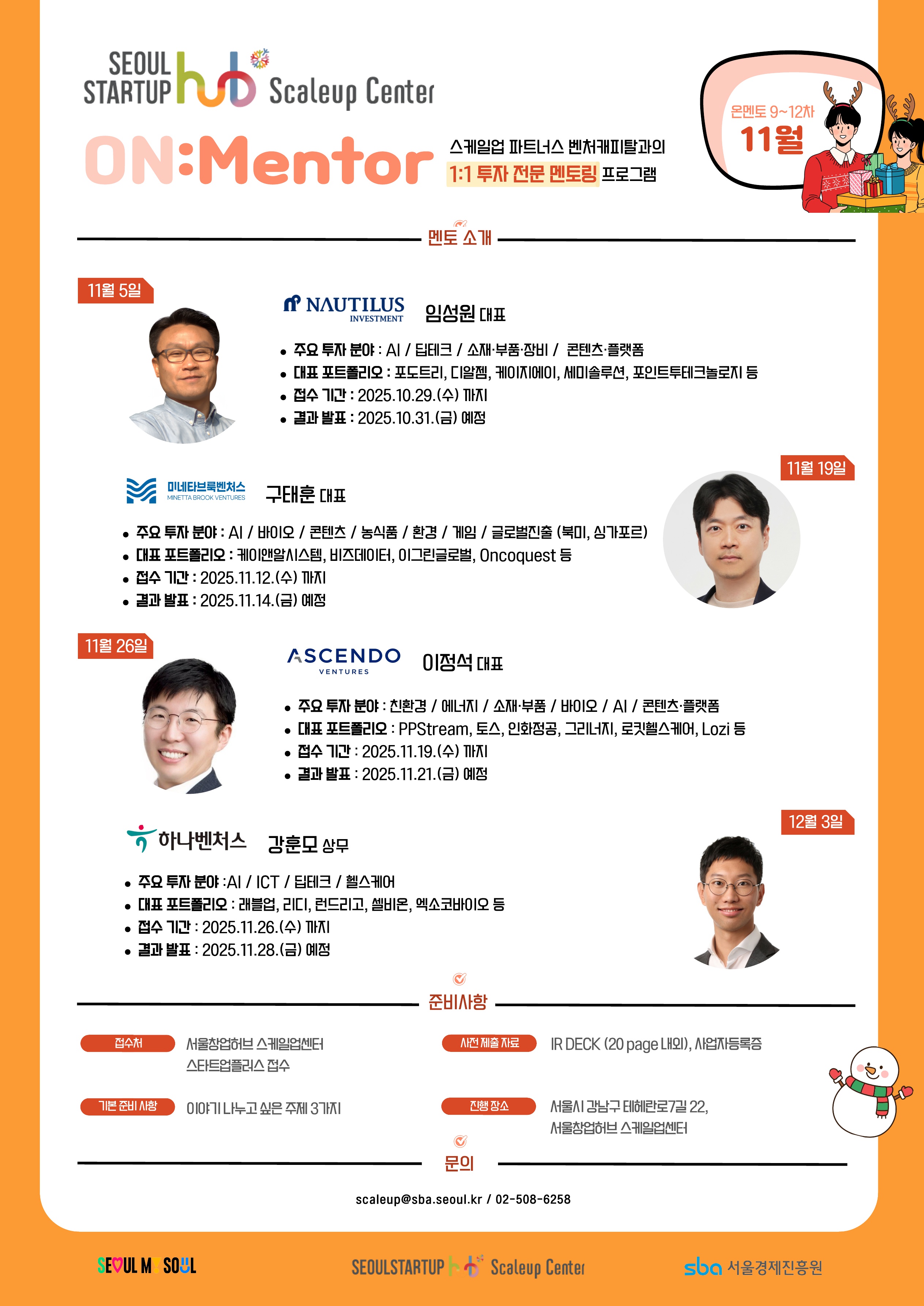 fnctId=bbs,fnctNo=597 페이지 공유 글번호 89917 [외부프로그램] [SBA] 서울창업허브 스케일업센터 ON:Mentor 프로그램 작성일 2025.11.04 수정일 2025.11.04 작성자 학생·취업과 조회수 19 첨부파일 첨부파일이(가) 없습니다.