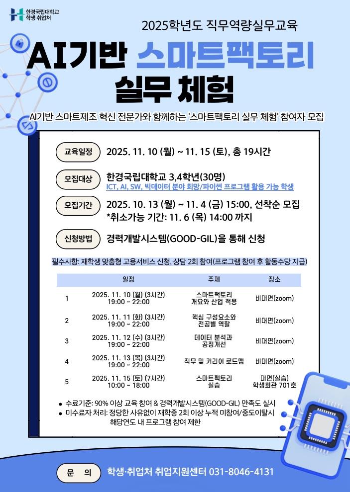 □ 한경국립대학교 학생·취업처(대학일자리플러스센터)는 재학생을 대상으로 2025학년도 직무역량실무교육인 ‘스마트팩토리 실무 체험 과정’을